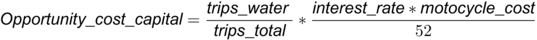 We assume the opportunity cost of capital for motorcycle vendors who own their vehicles is 12% (based on the yield of Kenya’s 10-year Treasury bonds, which ranged from 11.5%-12.5% in 2018). This represents a lower bound for the opportunity cost of capital. We weight the opportunity cost of capital by the proportion of trips for transporting water. We also divide the interest by 52 to obtain a weekly opportunity cost of capital.